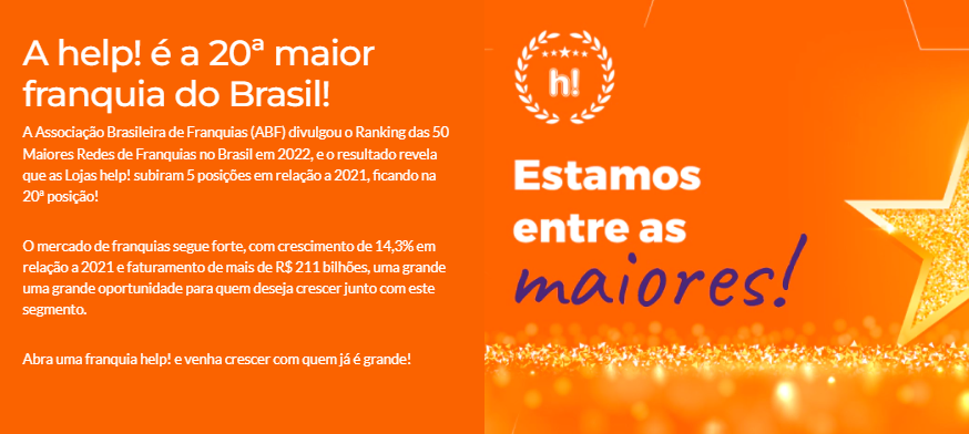 A help! é uma rede de franquias de lojas de crédito, com foco em oferecer soluções multisserviços para aposentados, pensionistas do INSS, servidores públicos, LOAS e assalariados. A help! ainda conta com a solidez do Banco Bmg, uma instituição com mais de 90 anos de experiência em serviços financeiros.
