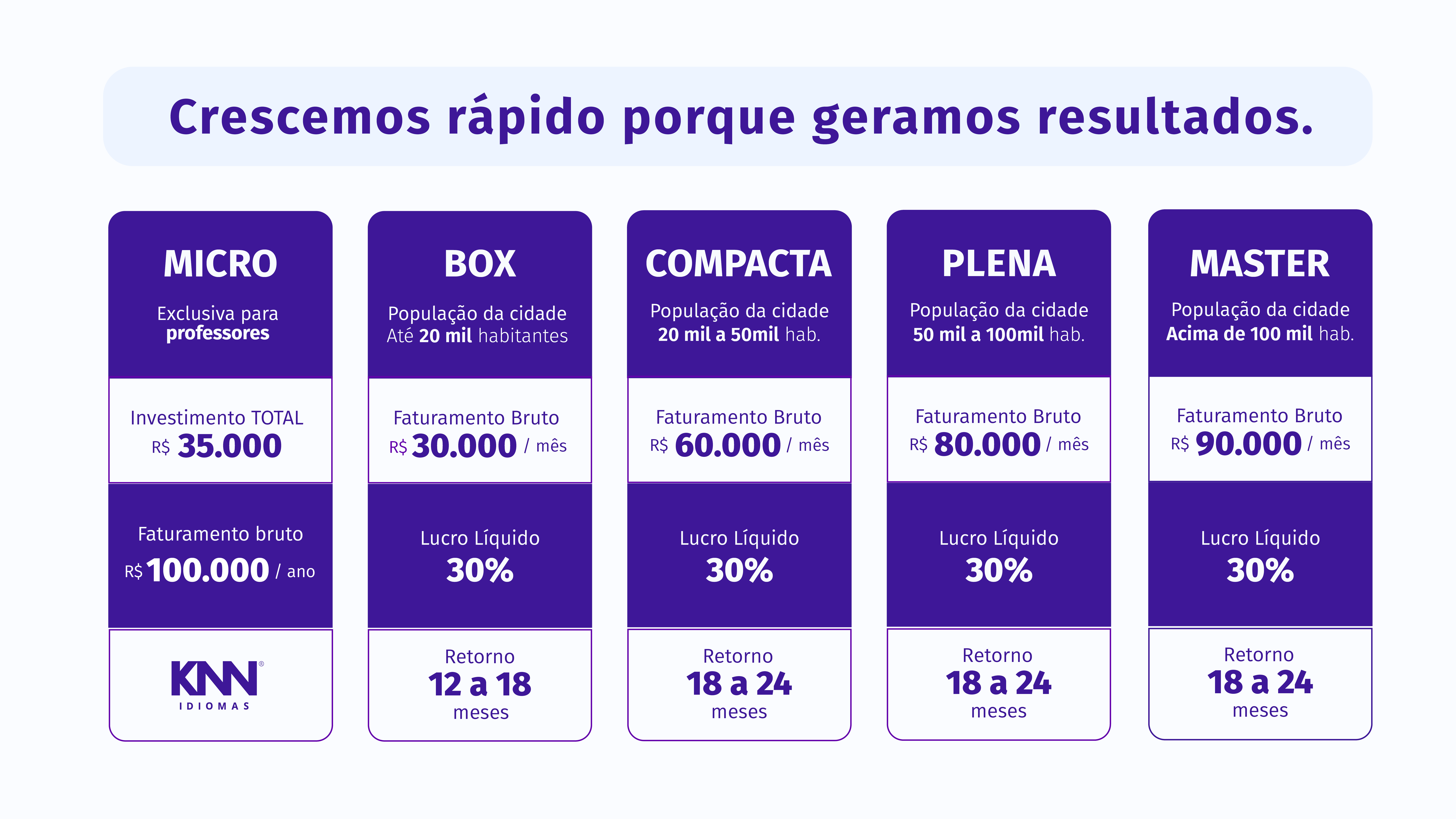 Investimento a partir de R$35.000 e retorno entre 12 e 24 meses com até 30% de lucro líquido.